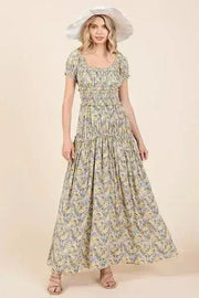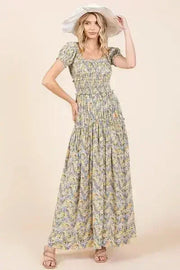 Floral Puff Sleeve Maxi Dress - Romantic Smocked Waist | Femstylo