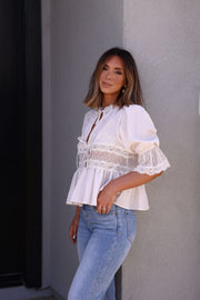 The Forever Young Top by Free People is a romantic statement piece made for effortless styling. Featuring puffy ¾ sleeves and a deep V-neckline, this top is elevated with delicate sheer lace trim and ruffled accents along the neckline. A flared hem and slim, relaxed fit give it a dreamy silhouette, while the button-front closure adds classic charm. Crafted from a lightweight blend, it’s perfect for pairing with denim or layered over a bralette for a chic, boho-inspired look.