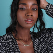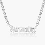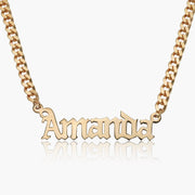 Our popular "Gothic Name Necklace" boasts a chic and elegant design, handcrafted to perfection. The model showcases the necklace with a 16-inch Cuban chain (see first image for reference).