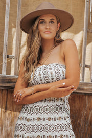 It's that border print combined with the asymmetrical hem that immediately grabs our attention! The color is also nicely balanced, so you don't get lost in the print! Other features include a smocked bodice and a ruffle detail at the bottom. It's quite flattering when paired with fringe booties, a wide brim hat, and a wood toggle necklace for the summer!