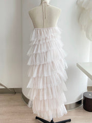Haltered Sliding Ruffle Layered Hem fit and flare tutu ankle length tulle prom dress