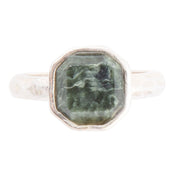 Experience the alluring combination of genuine green seraphinite and sterling silver in this beautifully crafted ring. The hammered texture adds a unique touch to the impeccable design. Featuring a .45" length and width, this ring weighs a solid 5.8 grams and boasts a captivating emerald green color with silver accents. Each ring is handcrafted for a truly one-of-a-kind piece.