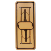 Wear-resistant, 3/4" thick melamine top with vinyl T-mold edge. Melamine sealed underside helps prevent moisture absorption. Full perimeter steel skirt support with plastic corners to protect surface when stacking. 1" diameter, heavy gauge steel legs with heavy-duty foot caps to protect floors. Heavy-duty leg supports and gravity leg lock for secure set-up. Folds to 2-1/2" for compact storage.