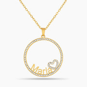 The Halo Name Necklace radiates charm with a delicate circular frame, shimmering stones, and a personalized name nestled beside a sparkling heart, perfect for adding a sweet, custom touch to your look.