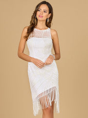 Cute illusion neckline fitted short dress embellished with beads and beaded fringes. You just found your bridal shower, bachelorette or new years eve dress!
