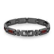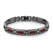 Men's gunmetal plated stainless steel link bracelet with Australian Jarrah wood inlays. Links are removable to adjust for size.