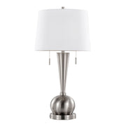 - Contemporary tapered cylinder shade atop a sturdy metal orb base
