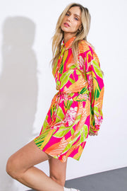 Immerse yourself in the luxury of this printed woven romper, designed with a sophisticated shirt collar, button down front, long sleeves, and an elegant elasticized waist with a tasteful tie.