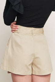 A solid woven tan skort featuring side pocket, self belt and side zipper closure.
