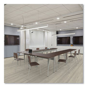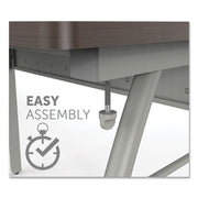 Scratch- and stain-resistant woodgrain laminate with durable edge and strong powder coated steel frame. Adjustable leveling glides for stability. Quick and easy assembly in minutes with no tools required. Configure multiple desks to perfectly fit your space. Includes metal modesty panels. Pedestals fit under desk.