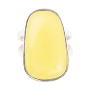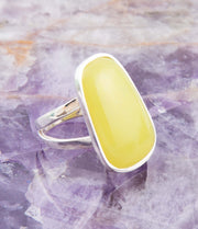 Experience the vibrant and elegant beauty of the Madeleine Yellow Jade and Sterling Silver Ring. Handcrafted with a high polish sterling silver bezel and band, this stunning ring showcases an abstract-shaped genuine yellow jade stone measuring 1.1" in length and .6" at its widest point. With its weight of 9.5 grams, this ring exudes a sense of luxury and sophistication in its yellow and silver tones. Elevate your style with this captivating piece!