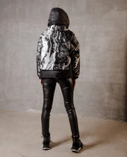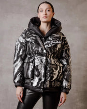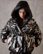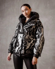 Introducing a luxurious jacquard down coat that effortlessly blends high fashion with warmth. This standout piece is made from premium-quality jacquard fabric featuring an intricate black-and-grey print, evoking timeless elegance and sophistication. Filled with high-quality down, this coat offers exceptional insulation for chilly weather without compromising on style. Details like a cinched belt add definition, while the high collar and practical pockets ensure both comfort and functionality. Perfect for making a statement while staying warm, this coat is a testament to refined craftsmanship and contemporary outerwear design.