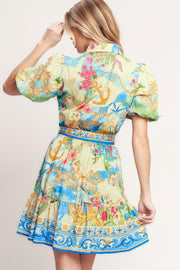 A printed woven mini dress featuring collar, short puff sleeve, front button down, elasticized waist with self sash tie and ruffle hem