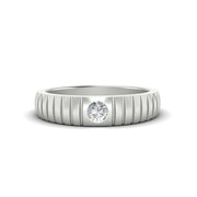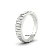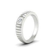 This mens diamond band features a shimmering round cut diamond held in the center of the ring in bezel setting. To accentuate the elegance of this wedding band for men, a number of vertical stripes are etched on either side of the center diamond on the top arch of the band.