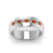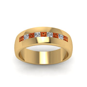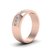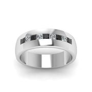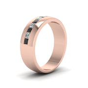 The Mens Channel Set Square Wedding Ring from Fascinating Diamonds features a row of small, sparkling princess-cut stones beautifully arranged in a classic channel setting on a thick, shiny wedding band. This band offers a sophisticated look that’s perfect for everyday wear.