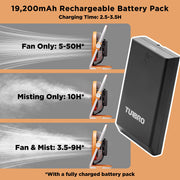 - Cordless Convenience: Powered by a 19,200mAh rechargeable battery, this fan offers cooling wherever you need it. With a full charge, the battery supports fan-only mode for up to 50 hours, mist-only mode for up to 10 hours, or a combination of fan and misting for up to 9 hours, with a constant water supply.
