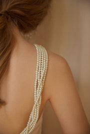 Halter neckline with hand-embellished pearl straps