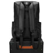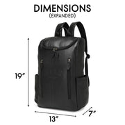 - Roamer Backpack (22.2L): Durable vegan leather backpack with large compartments, adjustable cushioned straps, and trolley sleeve. Dimensions: 13" × 7" × 19"; Weight: 1.9 lbs.