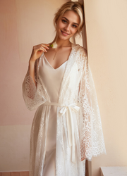This exquisite two-piece set features a sheer full-length lace robe with delicate floral embroidery and an ethereal hood for a soft, fairytale-inspired silhouette. Paired with a luxurious silky satin slip dress, this ensemble is perfect for bridal mornings, boudoir photoshoots, or honeymoon lounging.