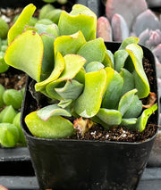 The Ruffle Jade (Crassula arborescens undulatifolia) is a unique and eye-catching succulent known for its wavy, ruffled leaves. Its thick, blue-green foliage has a subtle powdery coating and slightly curled edges, giving it a dynamic and sculptural appearance. As it matures, this slow-growing plant develops a sturdy, upright form, making it a standout in any collection.