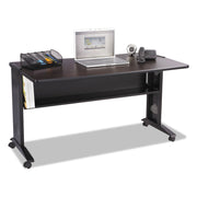 Melamine top reverses during setup for a choice of mahogany or medium oak finish. Black steel base with full-width 6 3/4" deep storage shelf. 12" modesty panel for privacy. Dual wheel casters (two locking) for easy mobility. Cable routing cutouts for installation along a wall.
