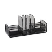 Organizer helps you effectively use desktop space. Features three vertical sections that hold file folders and binders. Two slide-out baskets hold small desktop items. Sliding shelves are ideal for small electronics or accessories. Durable steel mesh construction.