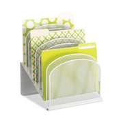 Tiered design saves desktop space and allows easier access. 1" wide sections for file folders or small binders. Steel mesh construction with powder coat finish for durability.