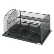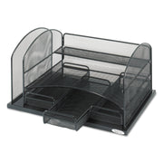 Store folders, pads, scissors, pens and more all in one well-designed organizer. Keep your desk essentials off your desk but within easy reach. Features one 2" section for a binder or folders, two trays and three drawers. Steel mesh construction is durable, strong and stylish enough for any decor.