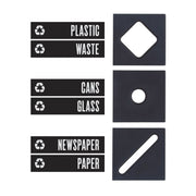 High-capacity, heavy-gauge steel containers and dedicated lids organize the collection of paper, cans, glass and waste. Hinged lid has opening for specific materials and includes appropriate self-adhesive label.