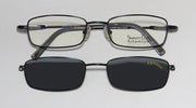 A set of optional sunglass clip-on lenses is included. Clip-ons are a convenient and affordable way for eyeglass users to shield their eyes from the sun's damaging rays and blinding glare. Clip-on sunglass lenses offer great flexibility for those who do not want to invest in two separate pairs of glasses. They clip on and off easily, usually with one hand.
