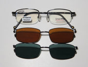 A set of optional sunglass clip-on lenses is included. Clip-ons are a convenient and affordable way for eyeglass users to shield their eyes from the sun's damaging rays and blinding glare. Clip-on sunglass lenses offer great flexibility for those who do not want to invest in two separate pairs of glasses. They clip on and off easily, usually with one hand.