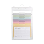 Saves desk space by utilizing often overlooked wall space. The six cascading pockets are removable to make viewing and access to documents easy. An elastic cord closure allows for secure and easy transport. Colored pockets each hold 50 sheets. Clear pocket on front allows for extra storage. Convenient loop on top for easy hanging. Durable poly material is tear- and moisture-resistant. Blank label sheet included.