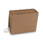 Organize large amounts of paperwork that need to be transported quickly, or file material without a file cabinet in this heavy-duty kraft organizer. Reinforced with poly tape at top for extra durability. Double-thick front and back panels with heavy reinforcement liner board. Each of the 21 pockets expands to 7/8". Protective flap with elastic cord secures documents.