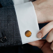 Smooth, shiny Tiger's Eye has been cut into a cushioned disc and surrounded gunmetal plated Sterling Silver to create this set of elegant cufflinks. These heirloom-quality cufflinks add a brilliant shimmer of elegance to any outfit while remaining masculine and dignified. The expert craftsmanship of our Sterling Silver cufflinks ensures long-lasting durability and a classic look that is sure to never go out of style.