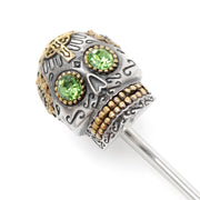 Expertly finished in sterling silver with gold accents and green jewels, adorn your jacket with this stick pin featuring a 3D Day of the Dead skull fixture at the top. Stick pins, like lapel pins, add sophistication and character. The expert craftsmanship of our Sterling Silver stick pins ensures long-lasting durability and a classic look that is sure to never go out of style. Comes in an Ox & Bull cylinder tube.