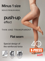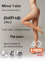 X-PRESS 40 tights with a unique "7-zone" torso design evenly reduce problem areas in the hips, waist, and abdomen by at least one size. Special elastic support inserts create a push-up effect for the buttocks, making them more lifted and rounded.