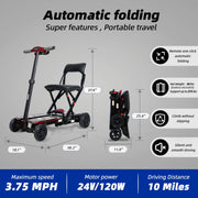 Introducing the Ultra Lightweight 4-Wheel Folding Mobility Scooter With Remote for Adults and Elderly, a sleek combination of style and functionality tailored for modern living. With its compact, fully foldable design, this scooter redefines portability. It folds effortlessly at the push of a button, transforming into a suitcase-like form you can easily tow through train stations, airports, or even store in the smallest spaces at home. Whether you're heading out to the park, running errands, or enjoying a day trip, this scooter ensures that you get there in comfort and style.
