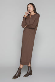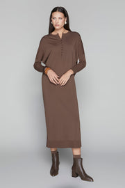 The Wren Dress is crafted from a luxe knit fabric that drapes beautifully for an effortlessly refined look. Featuring elegant dolman sleeves, subtle side slits for graceful movement, and a polished front button-down detail. Combining comfort with understated sophistication, This dress effortlessly transitions from casual to elegant.